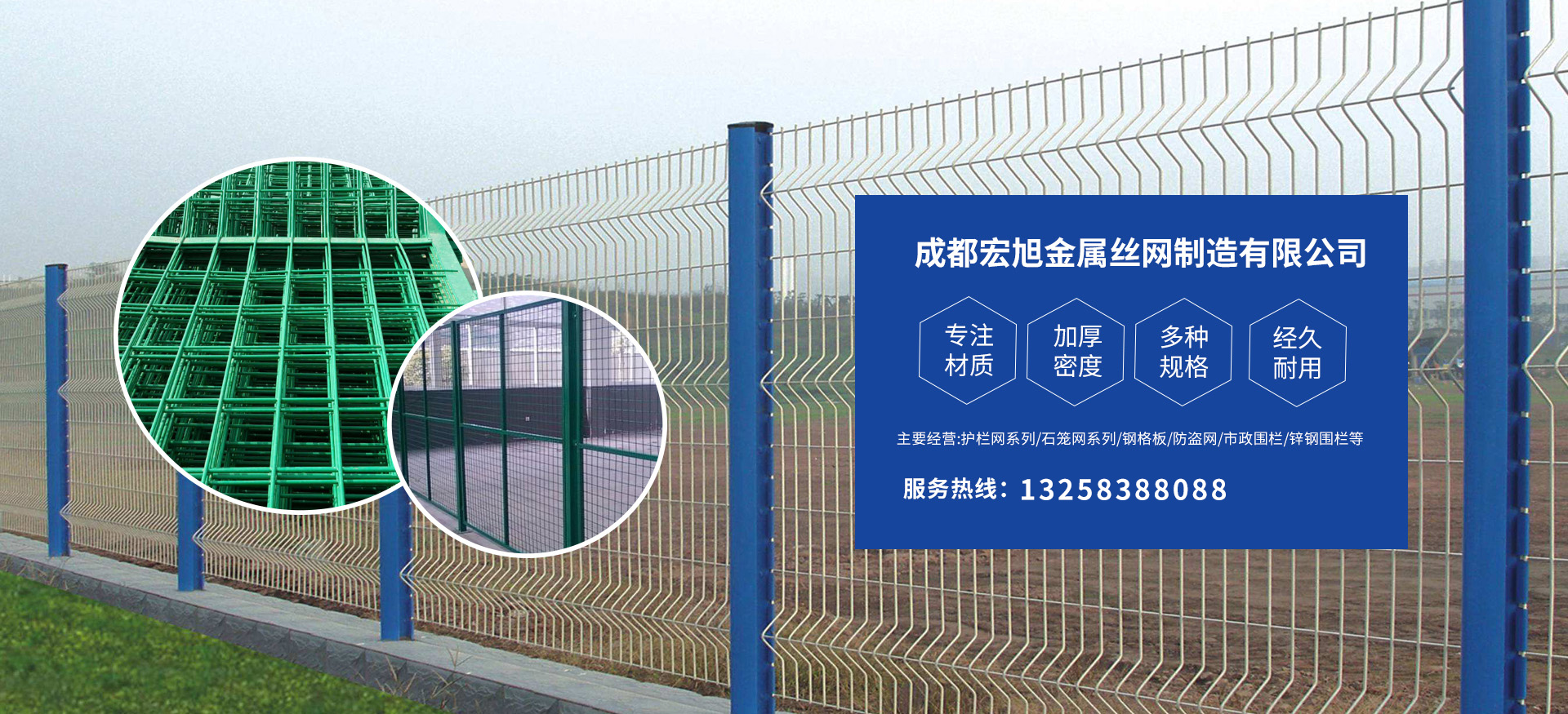 成都宏旭金屬絲網(wǎng)制造有限公司主營(yíng)護(hù)欄網(wǎng)系列、石籠網(wǎng)系列、鋼格板、防盜網(wǎng)、市政圍欄、鋅鋼圍欄、鋼筋網(wǎng)片、聲屏障系列、波形護(hù)欄板、柔性纜索護(hù)欄、SNS邊坡防護(hù)網(wǎng)等其他絲網(wǎng)類產(chǎn)品。特殊規(guī)格可加工定做,也可根據(jù)客戶來(lái)圖來(lái)樣定做。自創(chuàng)業(yè)以來(lái),公司一直堅(jiān)持市場(chǎng)為導(dǎo)向,以客戶為根本,以實(shí)業(yè)為基礎(chǔ),以技術(shù)為支持,以科研為后盾,集科研、生產(chǎn)、經(jīng)營(yíng)為一體,不斷研制開發(fā)新產(chǎn)品,開拓市場(chǎng),走綜合發(fā)展之路。多年來(lái),公司憑借過(guò)硬的質(zhì)量,良好的信譽(yù)、優(yōu)質(zhì)的服務(wù)、合理的價(jià)格,贏得了市場(chǎng)和商家的一致好評(píng)。